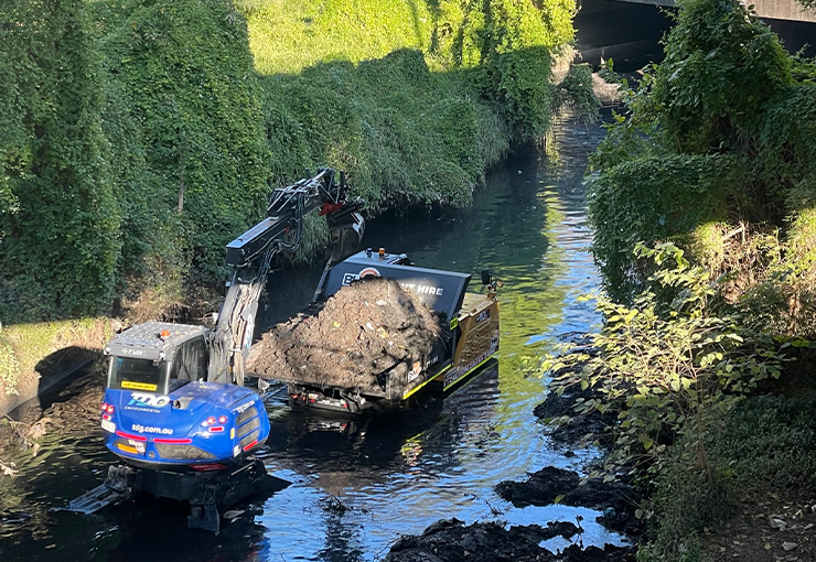 A canal in Sydney required vegetation removal and desilting works to restore proper water flow and reduce the risk of flooding during heavy rainfall. The site presented significant access challenges, including no ramp access and extremely tight working conditions. TDG Environmental was engaged to provide a solution that would overcome these limitations while ensuring safe and efficient removal of overgrowth and built-up sediment.
